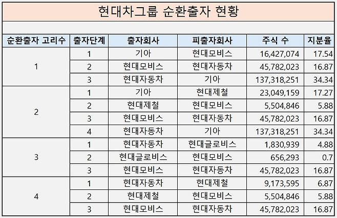 현대차그룹의 오랜 과제인 순환출자 문제는 올해도 여전하다. 정 회장을 중심으로 총수일가는 ‘현대모비스→현대차→기아→현대모비스’로 이어지는 지배구조를 통해 지배력을 유지하고 있다. 여기에 기아를 최대주주로 둔 현대제철도 현대모비스 지분 5.88%를 보유하며 구조 형성에 관여하고 있다.