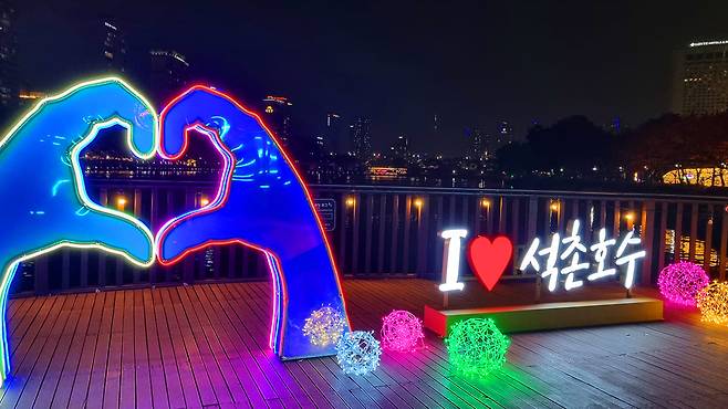 차가운 겨울밤, 서울 송파구 석촌호수가 화려한 빛의 옷을 입고 시민들을 맞이합니다.