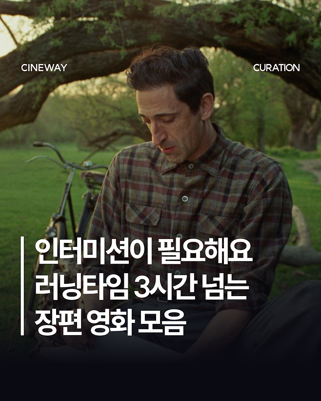 최근 개봉한 브래디 코베의 <브루탈리스트>는 러닝타임이 3시간 35분으로, 영화 중간에 15분 인터미션이 포함되어 있어요.