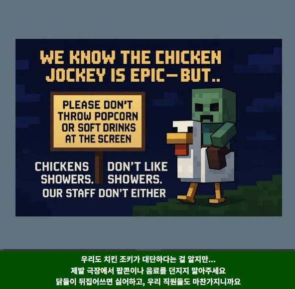 마인크래프트 게임 기반의 영화인 마인크래프트 무비가 한국에서는 4월 26일로 아직 개봉전이지만 미국에서는 4월 초에 개봉해서 역대 비디오게임 기반의 영화중 첫주말 흥행 1위를 기록할정도로 크게 흥행을 하고 있는데 특히 치킨조키 라는 밈 때문에 이슈가 되고 있습니다.