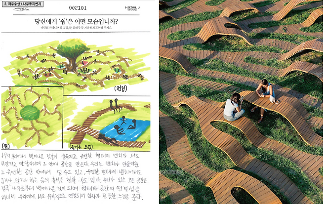 컴퓨터 알고리즘으로 디자인된 조형은 3차원 기하학적 모습으로 역동성을 보여줍니다. 내부의 금속 프레임으로 기본 구조를 만들고 외부에 데크 형식의 목재를 부착하여 마감합니다. 바닥은 철근 콘크리트 구조로 지지됩니다. 형태적으로 새롭지만 유지, 보수가 쉽고 방문자에게 익숙한 데크재 마감을 사용하여 시민들의 아늑한 휴식처로써의 활용을 용이하게 하였습니다.