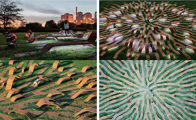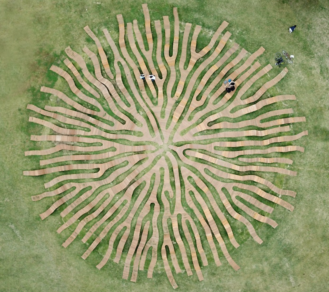 ‘벤치 하나 설치된 게 대수일까’ 생각하기 쉽지만 직접 보면 마음이 달라집니다. 건축가 이용주가 나무 뿌리의 모습을 형상화해 만든 설치 작품이자 공공 의자입니다. 이름도 귀여운 ‘뿌리 벤치’. 하늘에서 내려다 보면 중심부에서 길쭉한 목재 패널이 방사형으로 굽이치며 뻗어 나가는 모양으로, 그 위에 눕고 기대고 앉을 수 있습니다. 힘과 생명력이 느껴지는 디자인입니다. 휴식과 환기를 위해 공원을 찾는 사람들에게 이보다 더 적당한 벤치가 있을까요.
