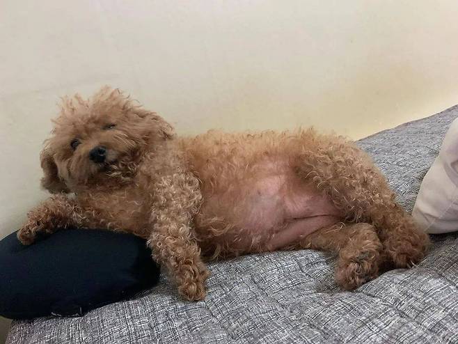 그런데 집에 돌아와 강아지의 잠자는 모습을 보고는... 놀랍게도 이 배는 임신한 수준이 아니라 '곧 출산할 판'이었습니다!