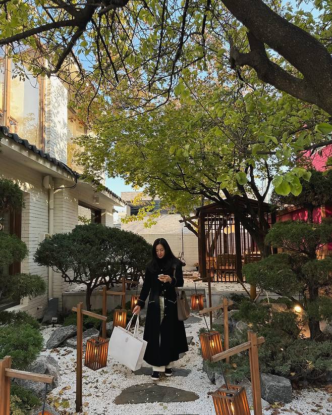 정원의 은은한 조명 아래에서 블랙 롱코트를 착용한 모습이다. 화이트 쇼핑백과 대비되는 올블랙 스타일링으로 시크한 분위기를 연출했다. 길이감 있는 코트와 편안한 실루엣이 돋보인다.