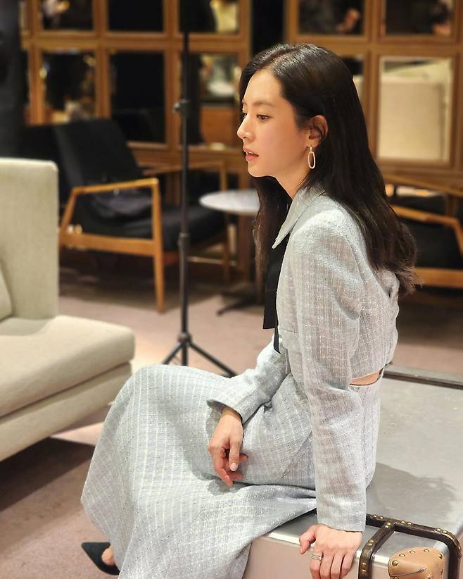 세련된 실버 컬러의 트위드 소재 투피스를 착용하고 있다. 허리라인이 돋보이는 재킷과 매치된 롱스커트는 고급스러운 분위기를 자아내며, 심플한 블랙 리본 타이로 포인트를 주었다. 오버사이즈 링 귀걸이로 모던한 감각을 더했다.