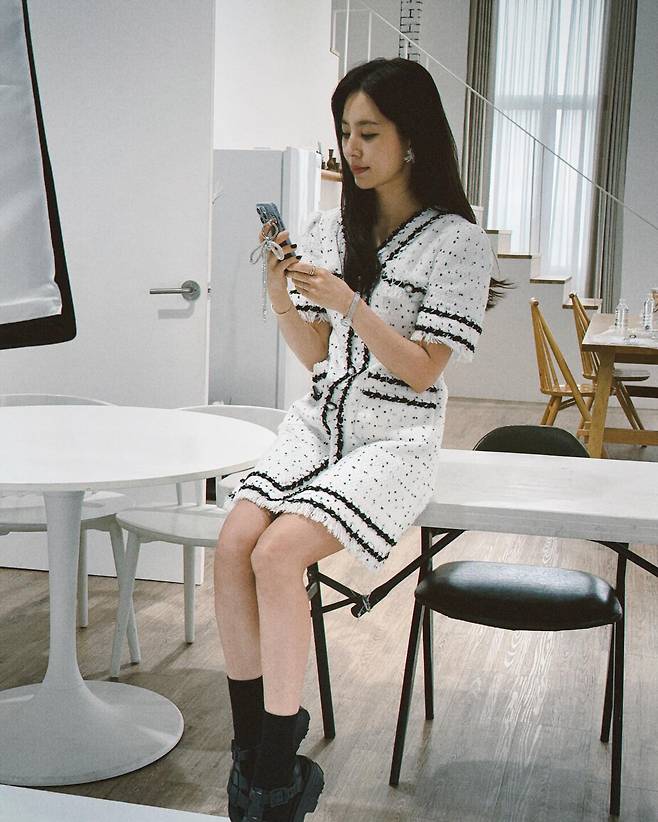 화이트 컬러의 트위드 원피스는 블랙 라인 디테일로 세련미를 더했다. 무릎 위 기장감의 실루엣이 여성스러움을 강조하며, 블랙 부츠로 트렌디한 스타일링을 완성했다. 프린지 디테일이 특징적인 이 원피스는 클래식한 무드를 현대적으로 재해석했다.