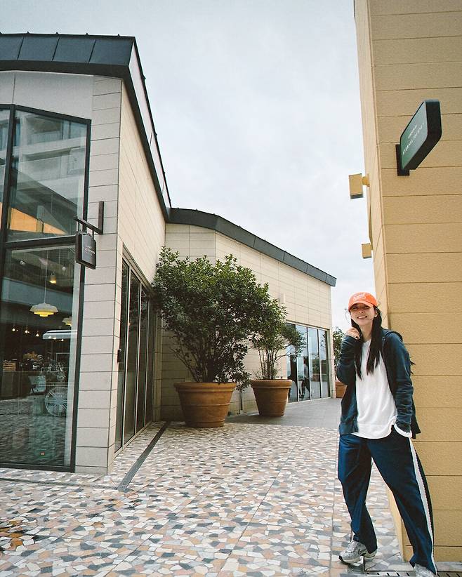 네이비 컬러의 트랙 재킷과 와이드 팬츠를 매치한 스포티한 착장이다. 오렌지 컬러 캡과 화이트 티셔츠로 경쾌한 포인트를 주었으며, 스니커즈로 편안한 스트리트 무드를 완성했다.