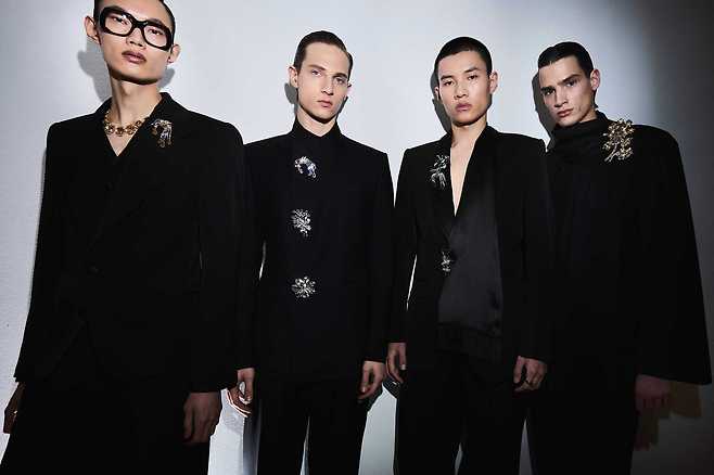 노상현은 같은 컬렉션의 우븐 레더 재킷과 블랙 팬츠로 올 블랙 룩을 연출해 특유의 남성적 매력을 뽐냈으며, 남윤수는 화이트 핀 스트라이프 슈트에 브로치와 볼드한 블랙 더비 슈즈를 매칭해 다른 배우들과 차별화된 색다른 매력을 전했다.