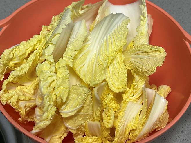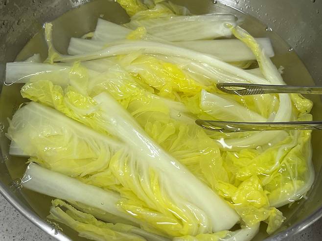 끓는 물에 배추를 넣어 30초에서 1분 정도만 데친 뒤 바로 찬물에 헹궈 열기를 빼 주세요. 배추는 너무 오래 데치면 조직이 물려져 식감이 떨어질 수 있으므로 유의해야 합니다.