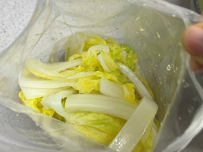 그다음 한 번 먹을 분량씩 나누어 지퍼백에 넣고 공기를 최대한 빼서 밀봉한 뒤 냉동 보관해 주세요. 이렇게 하면 몇 개월이 지나도 배추의 맛과 식감을 비교적 잘 유지할 수 있습니다.