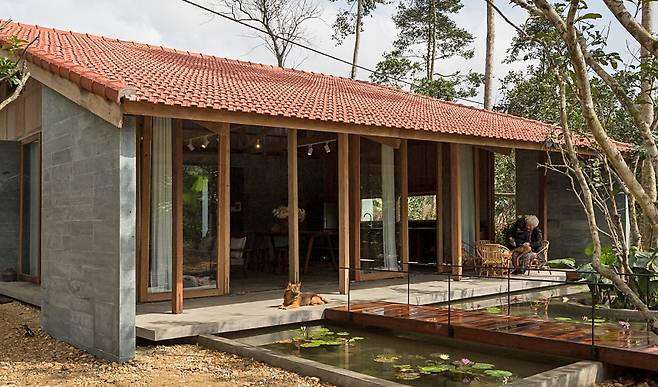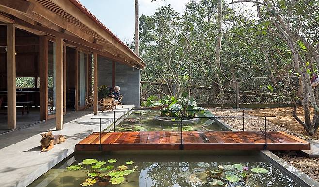베란다에서 뻗어 나와 연못을 가로지르는 이 구조물은, 가족이 오후 햇살 아래 모여 이야기를 나누는 장소이자 자연과 교감하는 통로이기도 하다. 목재 프레임으로 이루어진 방갈로는 물과 나무, 햇살이 어우러지는 풍경 속에 유려하게 자리한다.