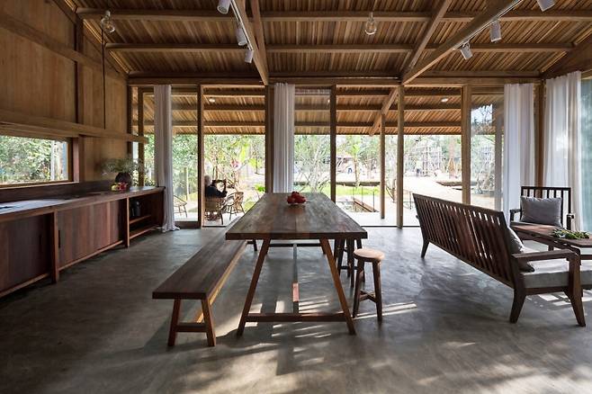 특히 가로 줄무늬로 구성된 창문은 내부와 외부의 경계를 흐릿하게 만들어, 실내에서도 자연의 기분을 온전히 느낄 수 있다.