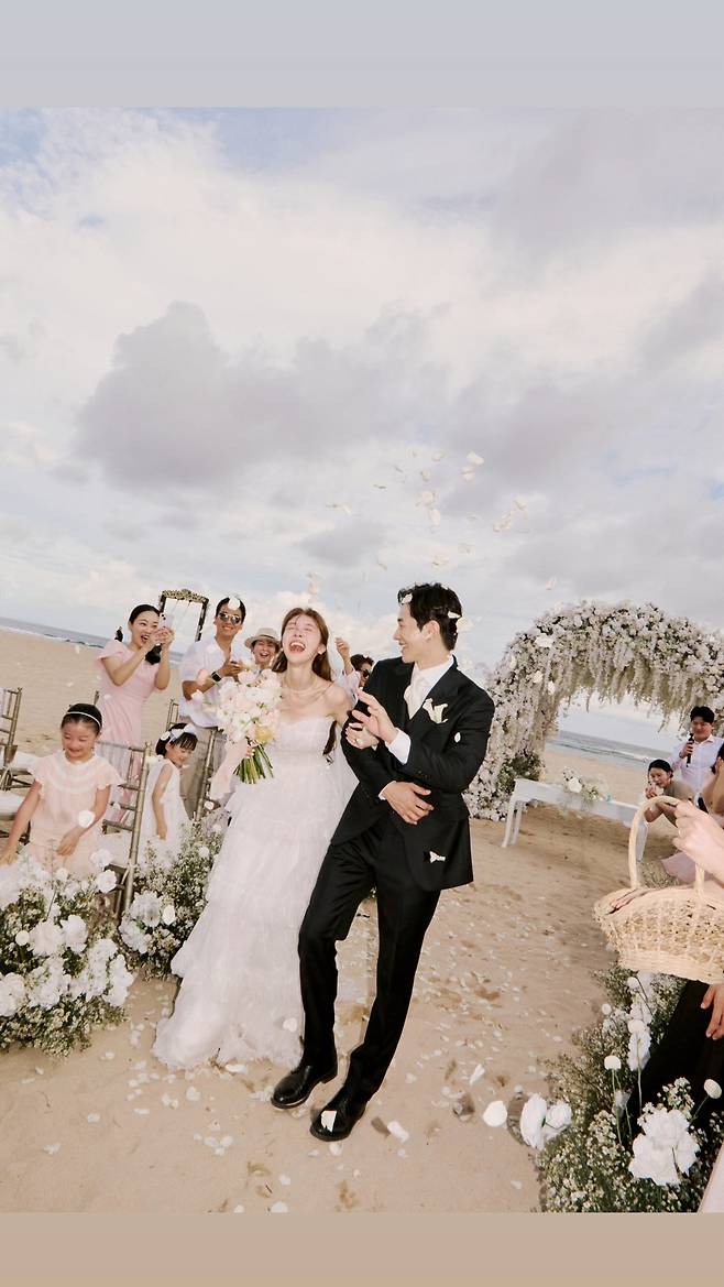 뜨거운 태양과 푸른 바다가 만나는 이국적인 해변, 하얀 꽃송이가 가득한 아치 아래로 신랑과 신부가 환한 웃음을 터뜨립니다. 하늘에서 흩날리는 꽃잎과 석양빛은 마치 영화의 엔딩 크레딧처럼 아름다운 배경이 됩니다. 단 한 차례의 열애설도 없이 부부가 된 배우 온주완(42)과 방민아(32)의 꿈결 같은 웨딩 모멘트입니다.