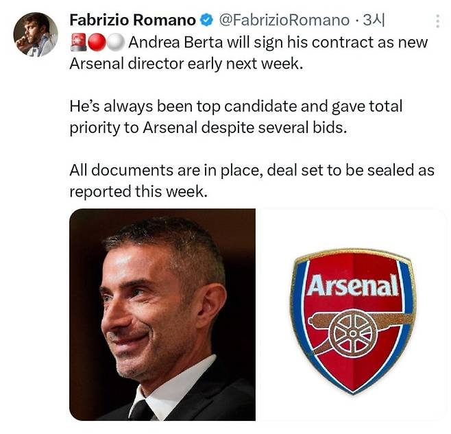축구 영입 전문 기자 파브리지오 로마노는 9일(현지시간) AT 마드리드의 안드레아 베르타 단장이 아스날의 신임 스포츠 디렉터로 부임한다는 소식을 전했다. 로마노 기자는 "안드레아 베르타는 내주 초에 아스날과 계약할 예정이다. 베르타는 아스날이 고려 중이던 여러 후보들 중에서도 우선 순위였다. 모든 서류는 작업됐고, 계약은 마무리될 것으로 보인다"라고 설명했다.