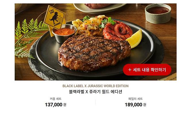 대표 메뉴는 육지, 바다, 하늘을 아우르는 식재료 조합으로 영화 테마를 표현한 스테이크 플래터다. 마블링이 풍부한 블랙라벨 스테이크와 문어, 치킨을 한 접시에 담아 시각적인 재미와 함께 다채로운 풍미를 자랑한다. 이 외에도 △치즈와 밥을 바삭하게 튀겨낸 '쥬라기 바이트 아란치니' △공룡알을 형상화한 디저트 '멜팅 다이노 쇼콜라 아이스크림'도 함께 출시돼 영화 팬들과 가족 고객 모두의 호기심을 자극하고 있다.