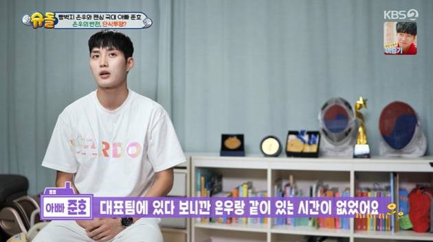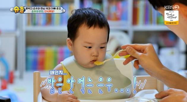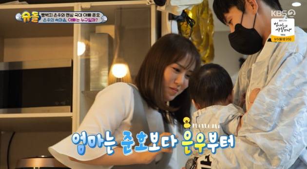 엄마가 떠나고 아빠와 함께 이유식을 먹는 은우는 김준호가 떠준 밥을 먹지 않았다. 급기야 고개를 돌려 식사를 거부했다. 김준호는 "현역 선수고 대표팀에 있다보니까 은우랑 같이 있는 시간이 없다. 시합 준비할 때면 두 달에 한 번 볼 때도 있다. 같이 있던 최장 시간은 2시간이었다"고 고백했다.
