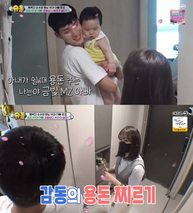 김준호의 아내는 김준호에게 해야할 것들을 적은 뒤 알려줬다. 김준호는 아내를 배웅하며 깜짝 용돈을 건넸다. 그는 "서프라이즈. 재밌게 놀다와"라며 미소 지었다. 내레이션을 하던 소유진과 육중완은 '최초'라며 감탄했다.