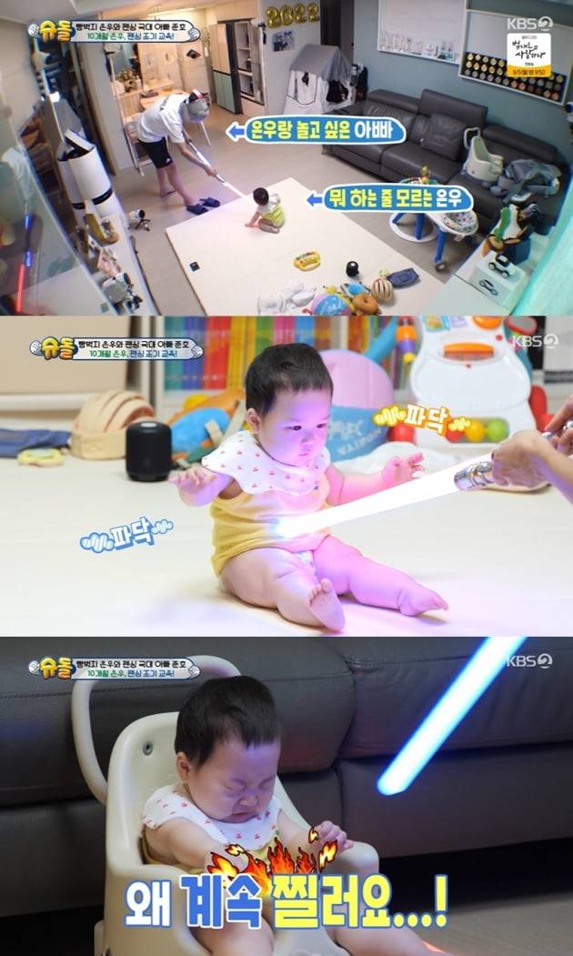 김준호는 은우를 앉힌 뒤 광선검을 꺼내 펜싱을 시작했다. 은우는 소리와 함께 빛나는 검에 관심을 보였고 꿀벅지를 흔들며 즐거워했다. 은우가 검 잡기를 거부하자 김준호는 "펜싱 선수 아들이 검을 무서워하면 어떡해"라며 계속 시도했다.