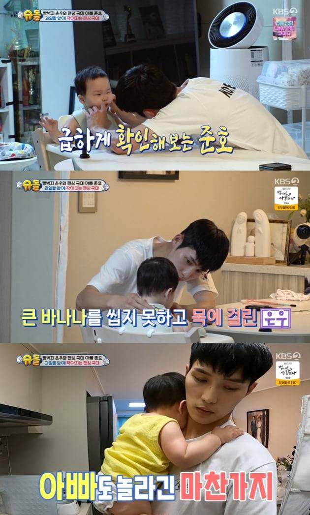낮잠에서 깬 은우는 김준호가 준비한 과일을 먹기 시작했다. 하지만 김준호가 바나나를 크게 썬 탓에 삼키지 못하고 목에 걸렸고, 이를 확인한 김준호가 재빨리 큰 바나나를 꺼냈다. 은우도 놀라 울음을 터트렸고, 김준호도 놀란 마음을 달래며 아들을 안았다.