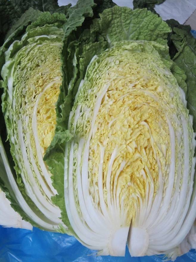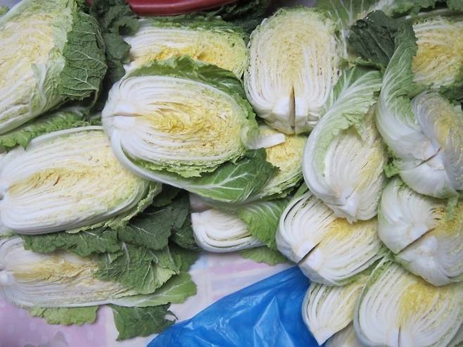 1. 배추 쪼개기: 배추는 속이 꽉 차지 않아 맛있을 것 같습니다. 배추를 먹기 좋게 쪼개 놓습니다.