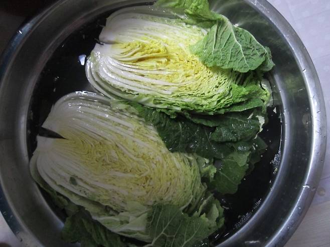3. 배추 담그기: 쪼개 놓은 배추를 소금물에 푹 담가줍니다.