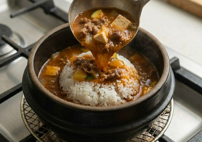 뚝배기에 밥을 담고 끓인 찌개를 부어바글바글 한 번 더 끓이면 완성입니다