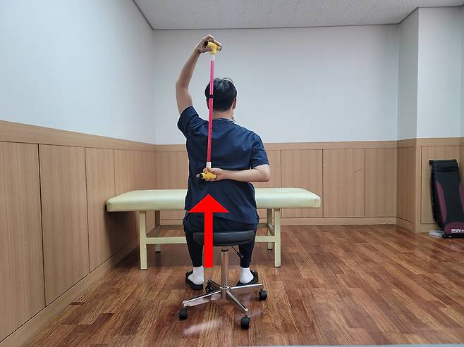 이 스트레칭은 어깨 관절 주변 근육을 자연스럽게 늘려주며, 관절 사이에 끼어 있는 피로감을 해소하는 데 효과적입니다. 단, 통증이 심하게 느껴지면 바로 멈추는 것이 좋습니다.