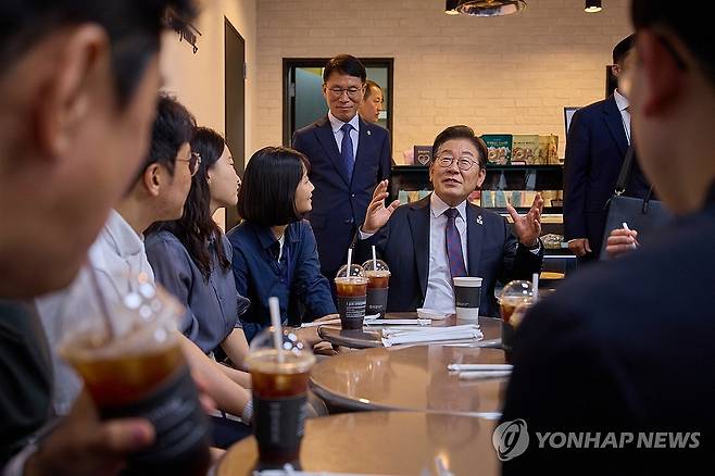 (서울=연합뉴스) 이재명 대통령이 10일 서울 용산 대통령실 청사 직원 식당에서 점심 식사를 한 뒤 구내 매점에서 출입기자들과 즉석 차담을 하고 있다. 2025.6.10 [대통령실 제공. 재판매 및 DB 금지]