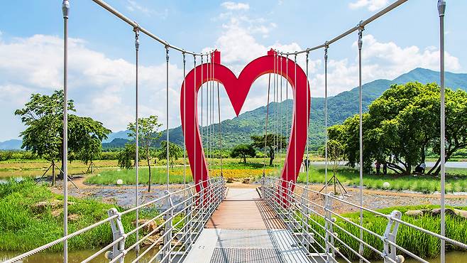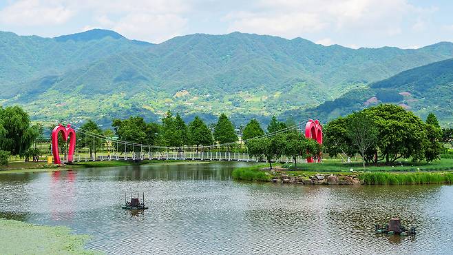 가장 대표적인 명소는 호수 위를 가로지르는 하트 모양 출렁다리. 두 발을 딛고 서 있는 순간, 자연과 하나 되는 감동이 밀려온다.