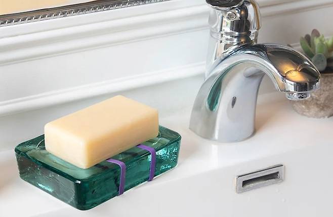 비누 받침대에 고무 링을 가로로 감아두면 물 빠짐이 좋아져 비누를 끝까지 단단하게 사용할 수 있다.