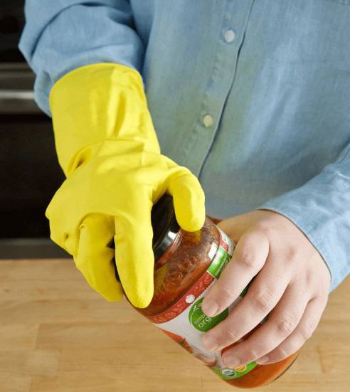 고무장갑 손바닥의 돌기 부분을 잘라 뚜껑 위에 덮으면 마찰력이 높아져 적은 힘으로도 쉽게 열린다.