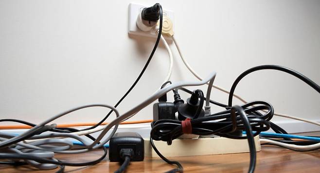 TV 거실장 아래 어지러운 전선은 고무장갑 팔목 부분을 잘라 감싸주면 깔끔하게 정리할 수 있다.