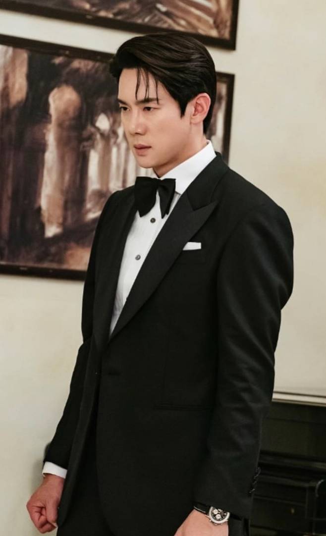 넓은 블랙 보타이는 얼굴 윤곽을 부드럽게 감싸며 단정한 인상을 주었고, 왼쪽 가슴 포켓의 화이트 포켓 스퀘어는 군더더기 없는 스타일에 완성도를 높였다.