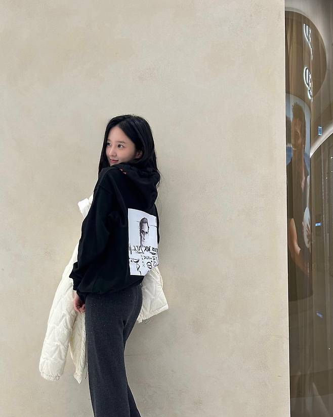 박정연이 모노톤 컬러의 미니멀한 스트리트 패션을 선보이고 있다. 블랙 후드 티셔츠에 그레이 팬츠를 매치한 그녀는 화이트 패딩을 손에 들어 포인트를 주었다. 특히 후드 티셔츠 뒷면의 그래픽 프린트가 심플한 룩에 포인트를 더하고 있다. 베이지 컬러의 벽을 배경으로 자연스럽게 뒤돌아보는 포즈는 캐주얼하면서도 세련된 분위기를 연출하고 있다. 이러한 모노톤 스타일링은 도시적인 감성과 함께 일상에서 쉽게 연출할 수 있는 실용적인 패션을 보여주고 있다.