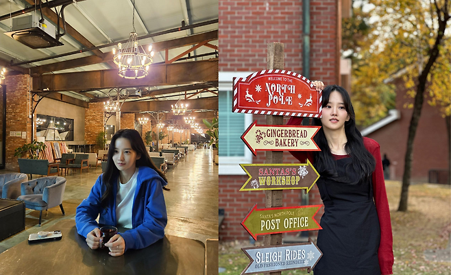 배우 박정연이 크리스마스 분위기가 물씬 느껴지는 홀리데이 룩을 선보이고 있다. 붉은색 상의와 검은색 에이프런 원피스를 매치한 그녀는 북극 마을을 연상케 하는 표지판 앞에서 포즈를 취하고 있다. 'WELCOME TO THE NORTH POLE', 'GINGERBREAD BAKERY', 'SANTA'S WORKSHOP' 등 크리스마스 테마의 표지판과 함께 한 박정연은 가을 단풍이 물든 배경과 어우러져 계절감 넘치는 스타일링을 완성했다. 특히 검정색 에이프런 스타일의 원피스는 캐주얼하면서도 세련된 느낌을 주며, 붉은색 상의와의 조화로 크리스마스 컬러 매치를 효과적으로 연출하고 있다.