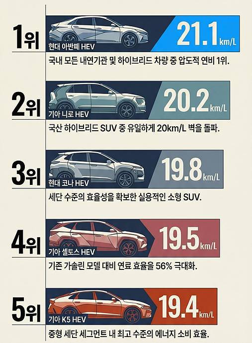 1위. 현대 아반떼 하이브리드: 21.1km/L