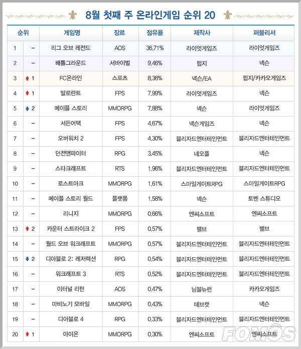 순위에 변동은 없었지만, 상위 20개 게임 중 가장 높은 상승률을 보였다. 전체 PC방 게임 중에서는 상승률 5위를 차지했다.