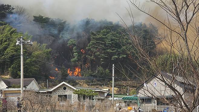 25일 울산시 울주군 언양읍 화장산에서 발생한 불이 인근 민가까지 번지자 산림당국이 산불 대응 1단계를 발령, 인근 마을에 대피령을 내렸습니다.