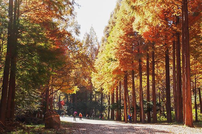 가을이 깊어지면 메타세쿼이아 숲이 은은한 주황빛으로 물드는 순간, 이곳만의 분위기가 절정에 다다릅니다. 다른 수종보다 단풍이 늦게 드는 편이라 11월 중순~말까지도 따스한 색감의 숲을 만날 수 있어 많은 여행자들이 늦가을 풍경을 보기 위해 일부러 이 시기를 찾습니다.
