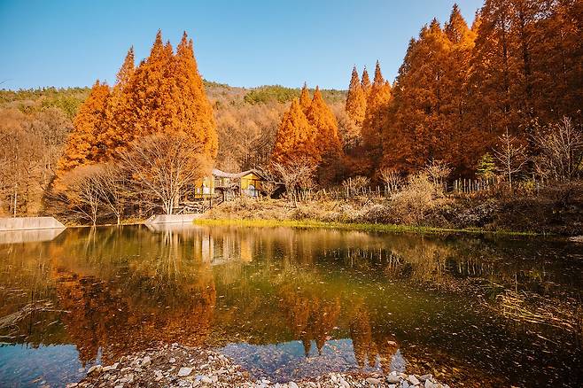 숲길을 조금 더 걸어 호수 앞에 서는 순간, 누구나 감탄을 멈추지 못합니다. 잔잔한 호수 위에 비친 노란 집과 메타세쿼이아의 수직 실루엣은 마치 작품처럼 고요하고 아름다워 ‘논산의 반영 포토존’으로 불릴 정도입니다.