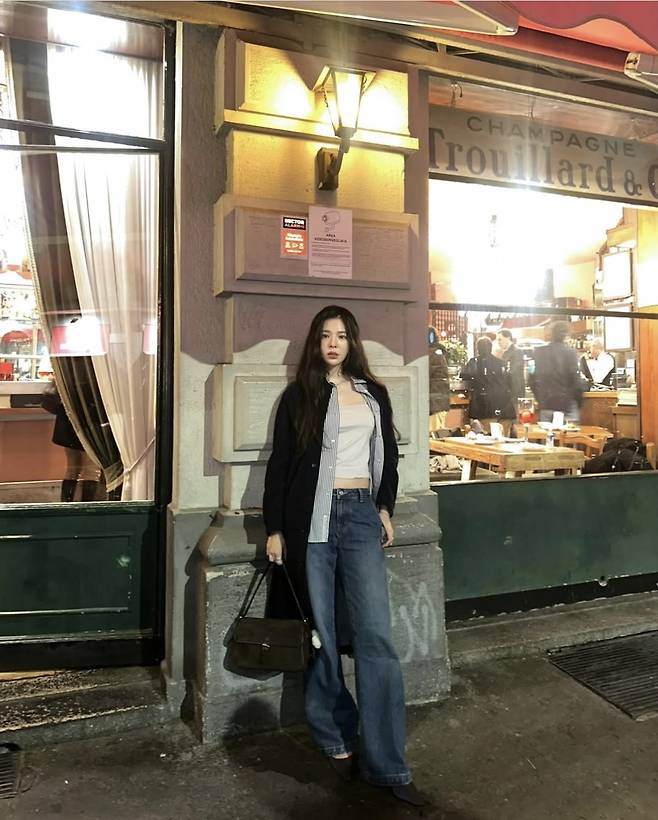 팬츠는 빈티지 무드가 물씬 풍기는 와이드 데님을 선택해 실루엣의 밸런스를 맞췄고, 여기에 슬림한 힐과 빈티지 백을 더해 전체 룩에 클래식한 깊이를 더했습니다.