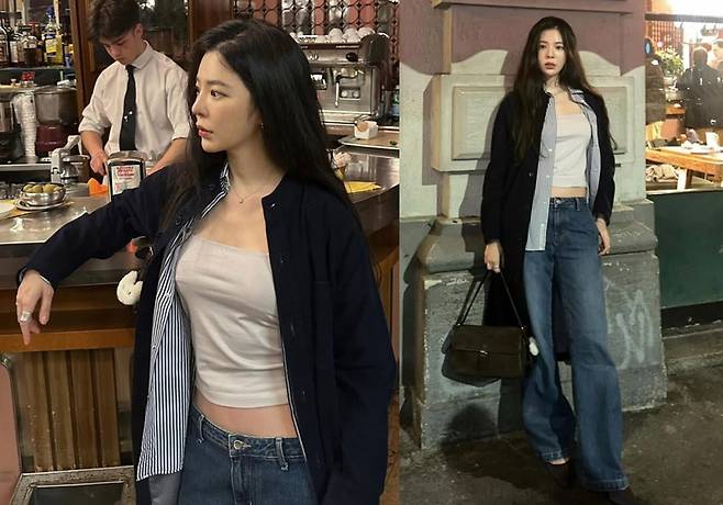장재인은 크롭탑 슬리브리스에 스트라이프 셔츠, 그리고 네이비 컬러의 캐주얼 코트를 레이어드하며 상의에 여유로운 실루엣을 연출했습니다.