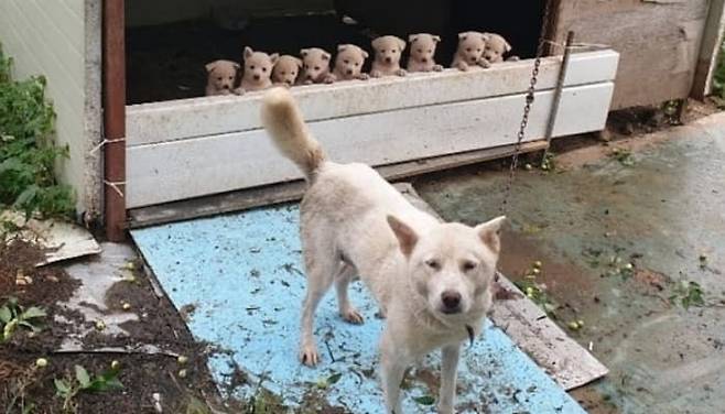 엄마 개는 마치 "이 아이들이 전부 제 자식들이에요, 대단하죠?"라고 말하려는 듯, 카메라를 향해 위풍당당한 표정을 지어 보입니다.