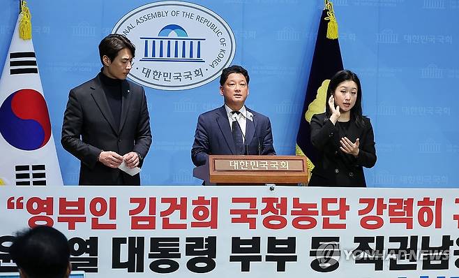 (서울=연합뉴스) 김주형 기자 = 김한메 사법정의바로세우기시민운동 상임대표 등이 4일 오후 국회 소통관에서 윤석열 대통령 부부 직권남용 혐의 등 공수처 고발 기자회견을 하고 있다. 2024.11.4