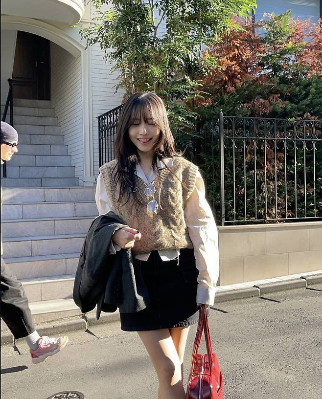 이솔이는 루즈한 화이트 셔츠 위에 브라운 컬러 니트 베스트를 레이어드하여 러블리한 분위기를 연출했습니다.