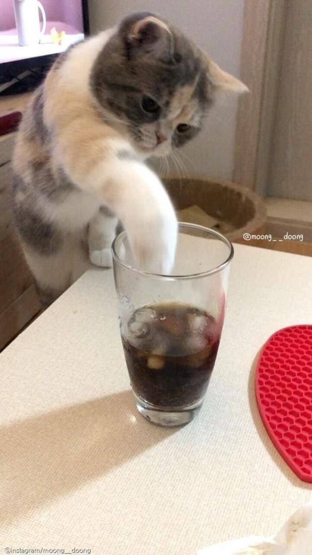 사람이 마시려고 떠 놓은 차가운 얼음물에도 앞발을 푹 찍어 맛을 음미한다는 녀석. 굳이 목이 마르지 않아도 심심할 때마다 물을 먹는 듯한 모습입니다. 그것도 '찍먹'으로 말이죠.