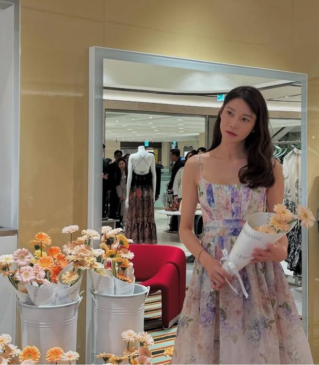 드레스는 얇은 숄더 스트랩과 자연스러운 A라인 실루엣으로 여성미를 극대화했으며, 파스텔 톤의 꽃무늬가 화사한 봄날 무드를 연출했습니다.