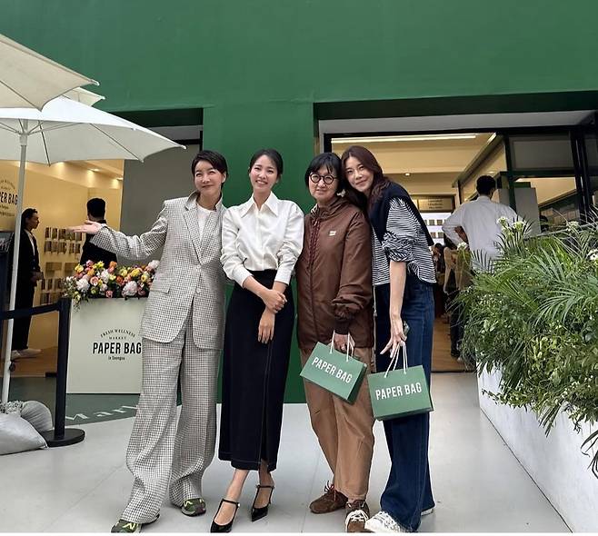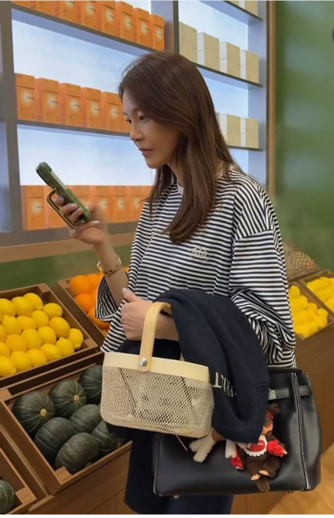 티셔츠는 루즈한 실루엣으로 여유로운 느낌을 주었고, 네추럴 톤의 메쉬 토트백과 블랙 레더백을 믹스 매치해 감각적인 실용미를 살렸습니다.