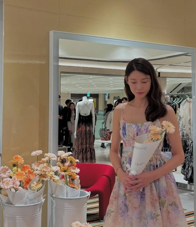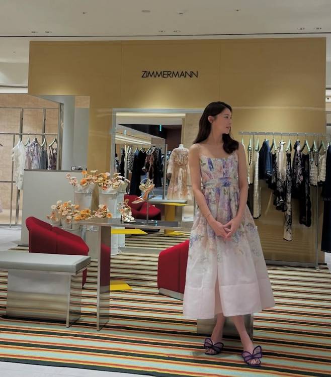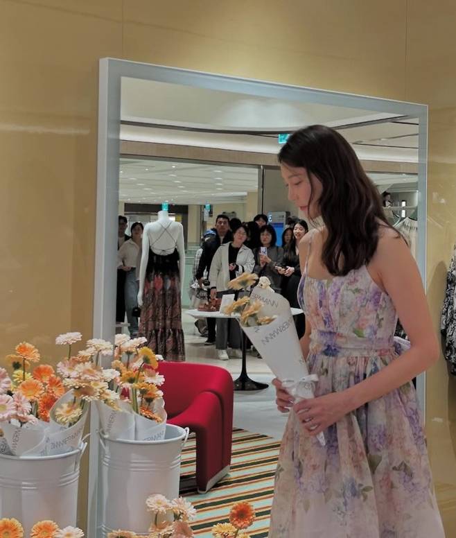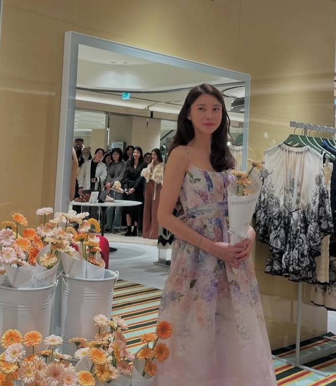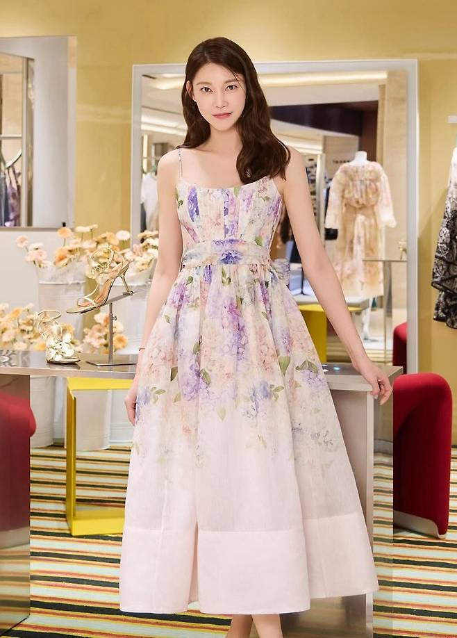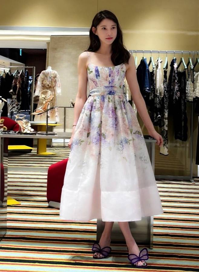 드레스는 얇은 숄더 스트랩과 자연스러운 A라인 실루엣으로 여성미를 극대화했으며, 파스텔 톤의 꽃무늬가 화사한 봄날 무드를 연출했습니다.