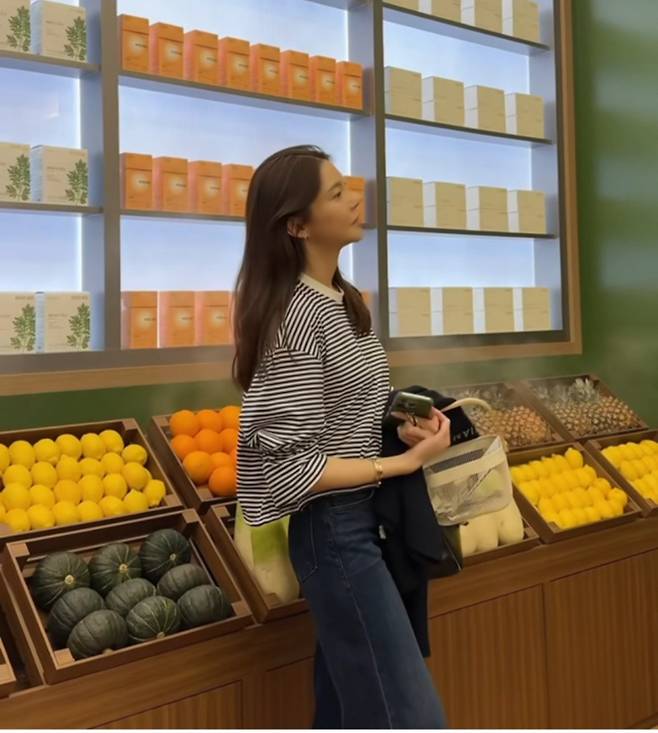 네이비 스트라이프 패턴의 오버핏 티셔츠를 착용해 편안하면서도 시크한 데일리룩을 선보였습니다.